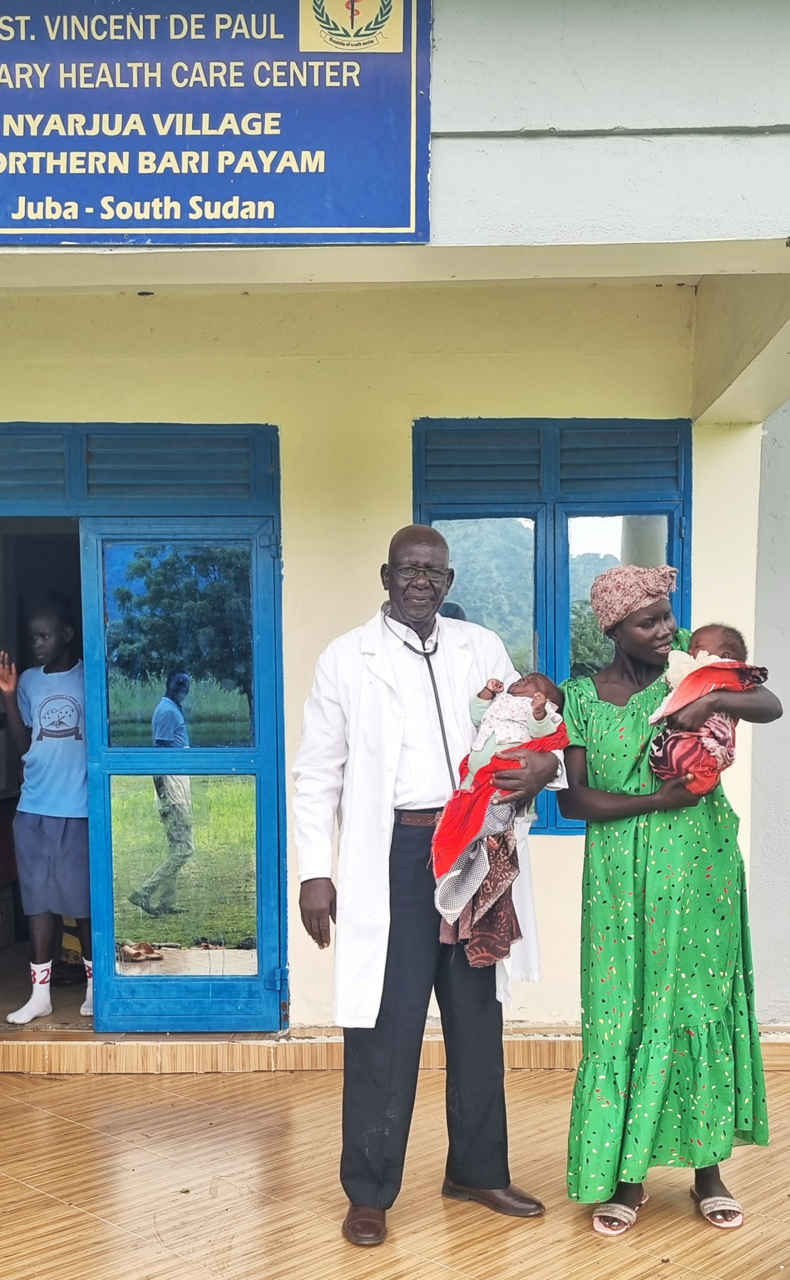 Un mère et ses jumeaux avec le médecin du centre de santé Saint-Vincent de Paul à Nyarjwa, Soudan du Sud. ©ASASE, 2025